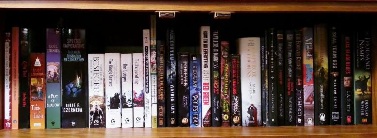 In the meantime, I spotted the image below on a friend's website. This past summer, I had sent him one of the few copies of my third draft for him to provide feedback on, and when he was done he put the book away in a safe place. I'd say I'm in good company in my friend's collection of signed books by well-known scifi and fantasy authors: